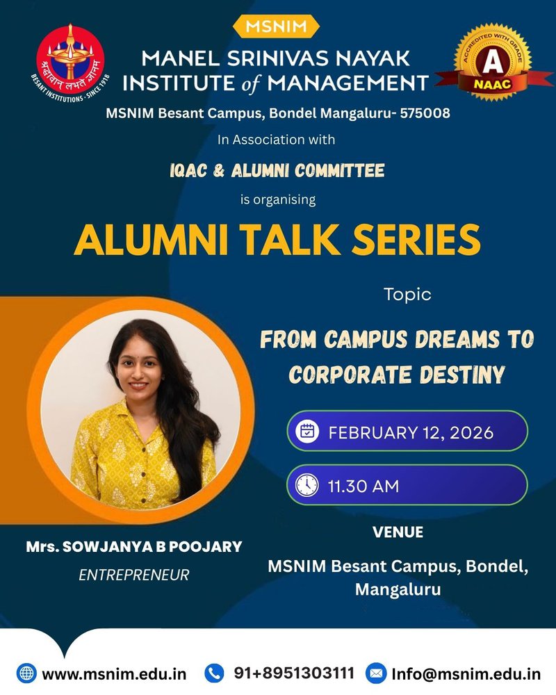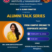 Alumni Talk Series - From campus dreams to corporate destiny February 12, 2026 Previous: Founder’s Day Celebration- Mangaluru Entrepreneurs' Day (Ideation '26) Next: Capacity Building Program - Prevention of Sexual Harassment (PoSH) of Women At Workplace And Higher Educational Institutes