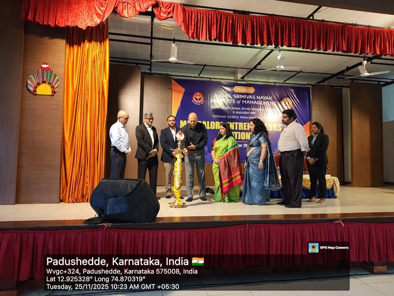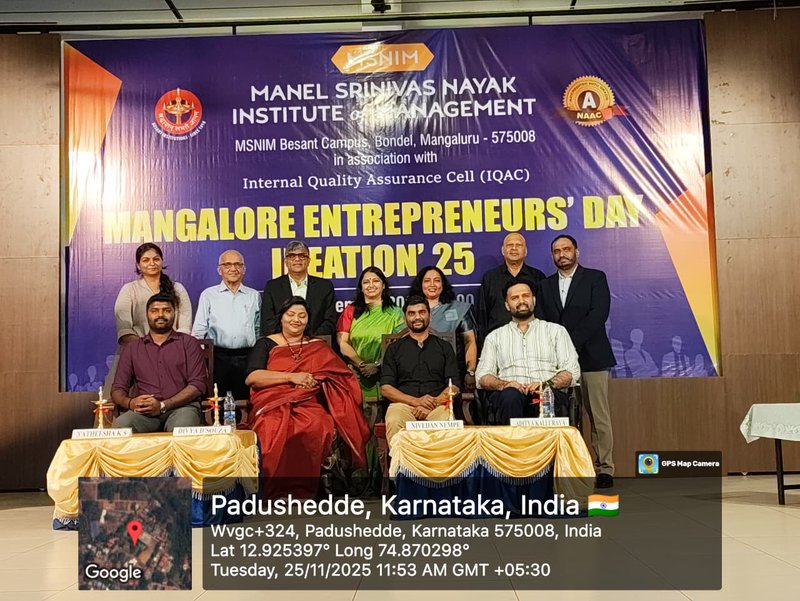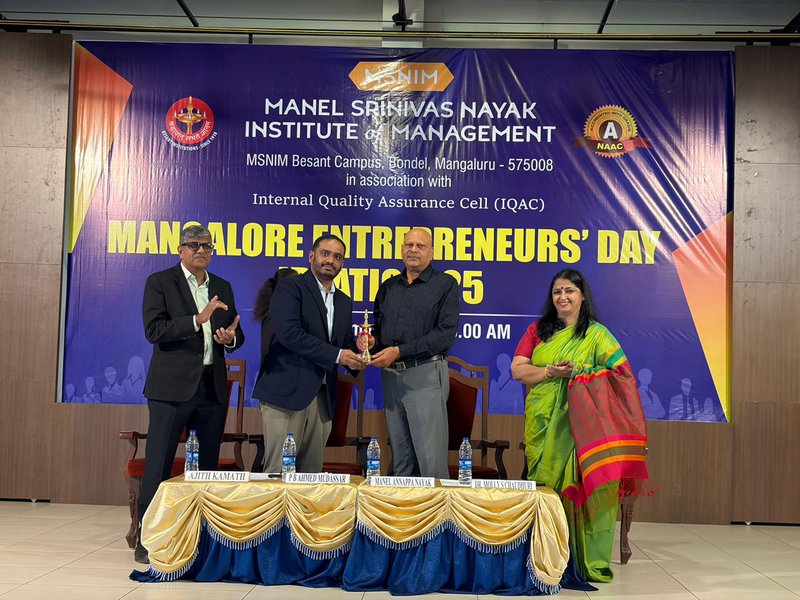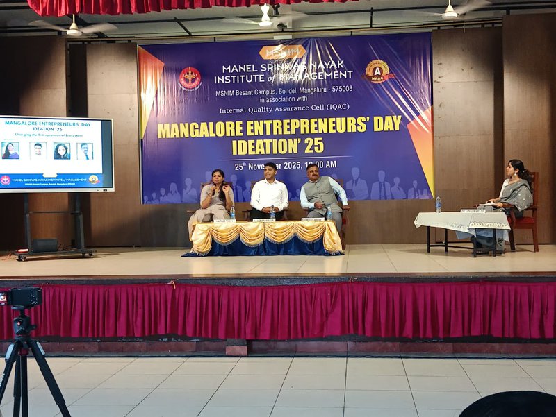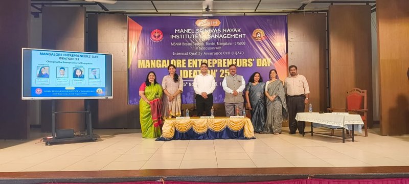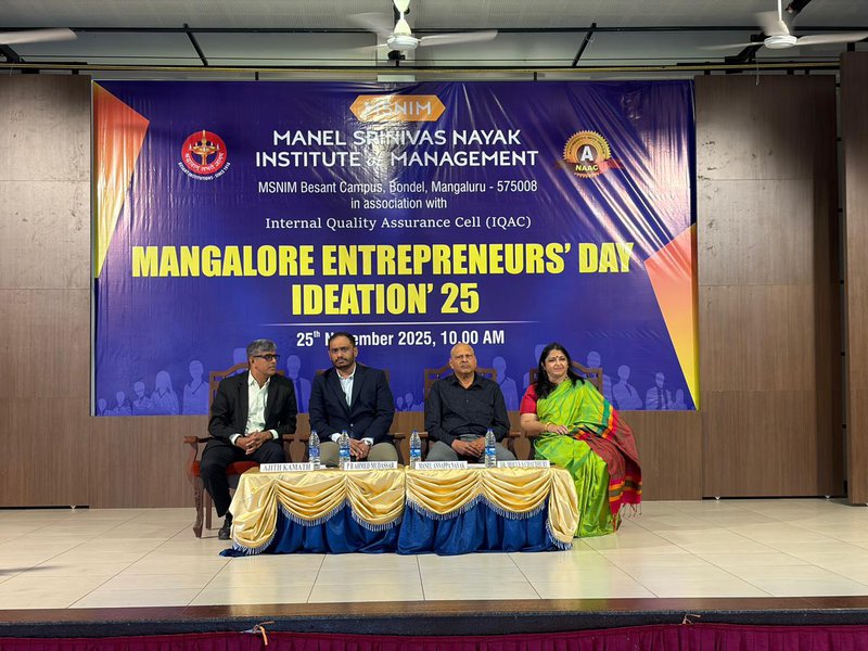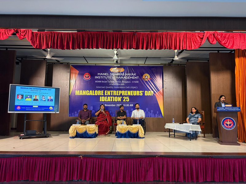 Manel Srinivas Nayak Institute of Management (MSNIM) successfully hosted Mangalore Entrepreneurs’ Day – IDEATION ’25 on 25th November 2025, with the vision of nurturing entrepreneurial thinking and fostering collaboration among business leaders, investors, startups, and aspiring entrepreneurs. Designed as an action-oriented platform rather than a ceremonial gathering, the event focused on sparking ideation, strengthening networks, and encouraging business-building initiatives that contribute to Mangaluru’s growing entrepreneurial ecosystem.