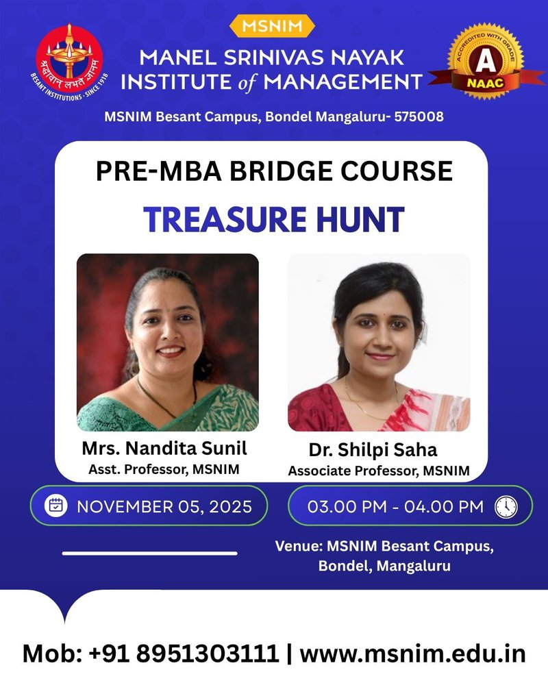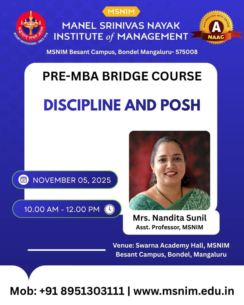 Pre-MBA Orientation Program for 27th Batch - Discipline and POSH, Library Management Resources, Placements, Treasure Hunt November 5, 2025 Previous: Pre-MBA Orientation Program for 27th Batch - Corporate Etiquette, Working under Pressure, Exploring Institutional Extra-curricular and Co-curricular activities, Rest your Time Next: VibeZ 2025 - Your Stage, Your Story, Your VibeZ