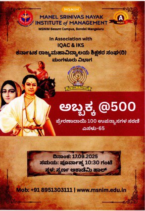 The Karnataka Rajya Mahavidyalaya Shikshaka Sangha (R.), Mangaluru, in association with Manel Srinivas Nayak Institute of Management (MSNIM), Bondel, Mangaluru, organised a special programme titled “Abbakka @ 500, Preranaadaayi-100 Upanyaasagala Sarani – Episode 65” on 15 September 2025 at 10:30 a.m.