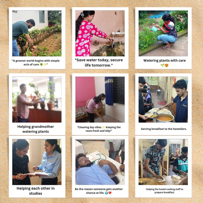 In promoting environmental sustainability and cleanliness, students watered plants, assisted gardeners, created awareness about water conservation, and participated in cleanliness drives to maintain a healthy campus. Their community-oriented efforts also included supporting hostel mates and helping elders by watering plants and contributing to a cleaner, greener environment.